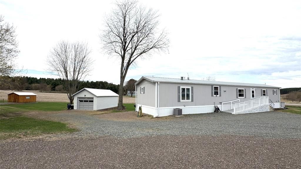 Charming and efficient manufactured home on the edge of Northfield with town and country views on a spacious 1.63 acre lot!!! Inside you will find a bright open layout with plenty of natural light. The kitchen boasts a breakfast bar, new island, backsplash and gas stove. The bedrooms are a split layout with a private master bedroom on one side of the home and two bedrooms and a full bath on the other side. The master bath has undergone major upgrades such as a new barrier free shower, countertops, fixtures and ship lap walls. Other updates include NG furnace '24, gas stove, washer, dryer and garage door opener '25, steel roofs on all buildings, new survey in '25 and other plumbing updates '26. Outside you will find a one car, 14 x 28' garage with concrete, shelving and new opener. There is also a 10 x 20' storage shed for all your toys, lawn equip. etc. Great location on I94 Exit 98 for easy commute! Approx. 20 min. to Black River Falls, 10 min to Osseo, 25 min. to Eau Claire and 15 min. to Whitehall (school district) Small town living at its finest with country views in every direction.