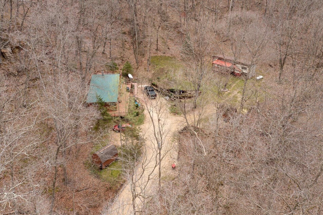 Tucked away on 13.06 wooded acres, this charming cottage style retreat offers the perfect blend of privacy, nature and comfort. Set on a quiet road surrounded by mature trees, the property provides a truly secluded setting. Inside you'll find a warm and inviting living area with a cozy gas stove, ideal for relaxing year-round. The efficient layout includes a one bedroom loft that adds charm while maximizing functionality. A newer steel roof provides long lasting durability and low maintenance. Step outside and take in the stunning rock outcropping just behind the home, the expansive wrap around deck is perfect for relaxing, entertaining, or simply taking in the quiet beauty. Property also includes a 2-car garage, storage sheds and fifth wheel camper.